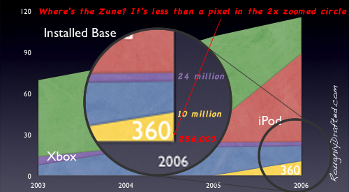 One reader asked why the Zune was missing from the main title graphic of installed base for the iPod and various existing game consoles. The obvious answer is: perhaps it's not really missing, but just that a few thousand units sold doesn't show up on a chart of 120 million units.